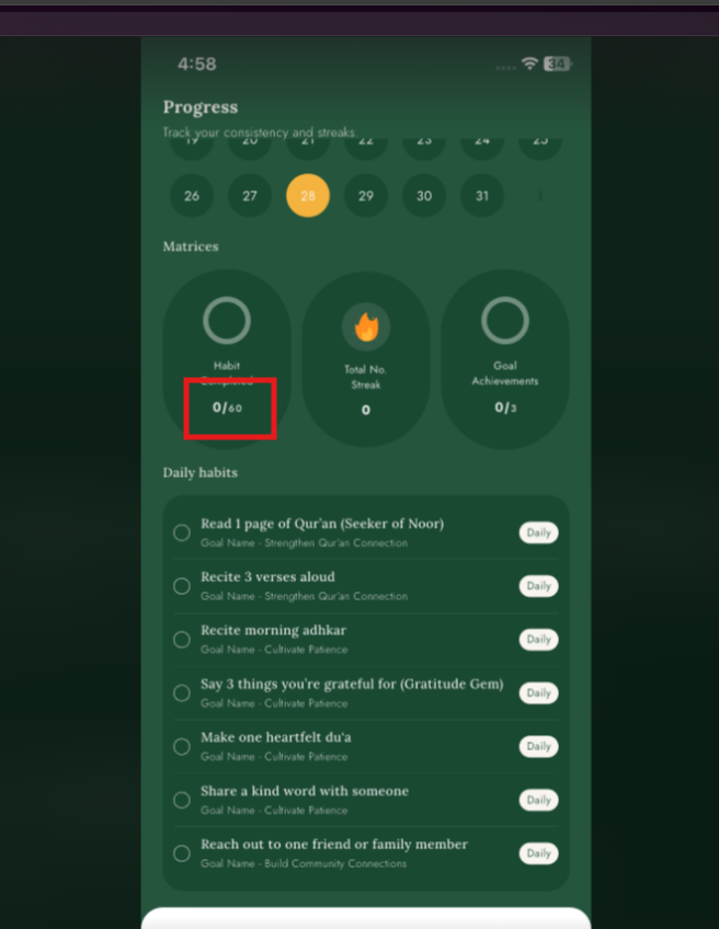 Issue: Total count shown under Matrices is inaccurate and does not match actual habit completion data.